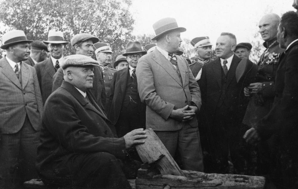 Latvijas Valsts un Ministru prezidenta Kārļa Ulmaņa un valdības pārstāvju vizīte Liepājā, par godu Latvijas Pagaidu valdības ierašanās 18. gadadienai. Valdības pārstāvju ceļojums pa Kurzemes jūrmalu, viesi kādā Nidas ciema zvejnieka saimniecībā. Priekšplānā ar ēveli Kārlis Ulmanis. Fonā no kreisās: 2. iekšlietu ministrs Vilis Gulbis, 4. Latvijas armijas štāba priekšnieks, ģenerālis Mārtiņš Hartmanis, 5. Valsts kancelejas direktors Dāvids Rudzītis, 7. zemkopības ministrs Jānis Birznieks, 8. Rīgas Valsts prezidenta pils komandants, pulkvežleitnants Raimonds Bebris, 9. Liepājas pilsētas mērs, Aizputes baptistu draudzes mācītājs Evalds Rimbenieks (arī Ēvalds Rimbenieks), 10. Kurzemes divīzijas komandieris, ģenerālis Oskars Dankers.