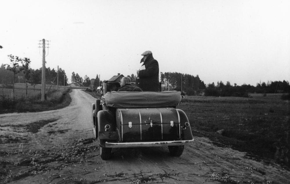 Latvijas Valsts un Ministru prezidenta Kārļa Ulmaņa un valdības pārstāvju vizīte Liepājā, par godu Latvijas Pagaidu valdības ierašanās 18. gadadienai. Valdības pārstāvju ceļojums pa Kurzemes jūrmalu. Automašīnā uz lauku ceļa, no kreisās: 1. kara ministrs, ģenerālis Jānis Balodis, 2. Kārlis Ulmanis.