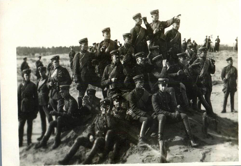 Latvijas Kara skolas kadetu militāro mācību laikā uz novērošanas punkta Daugavpilī. Grupas foto.