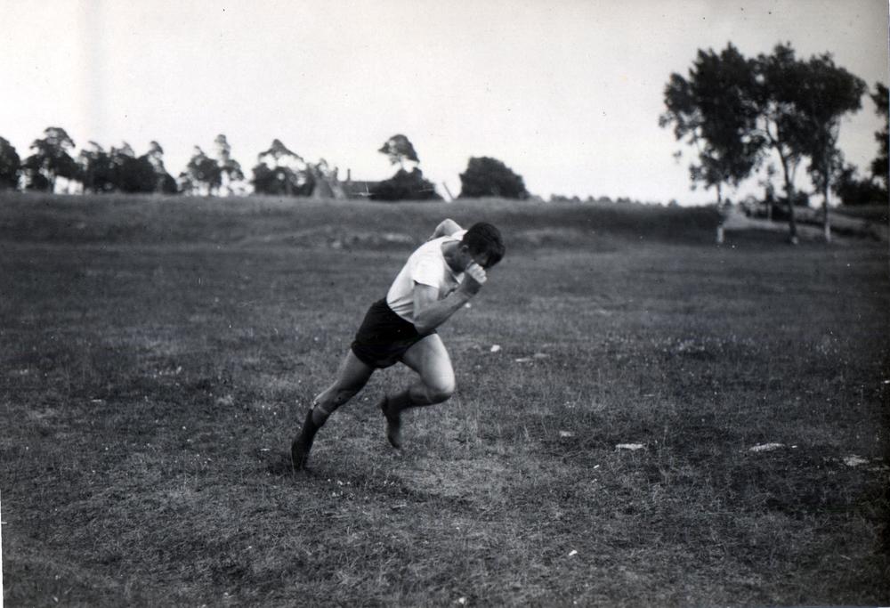 Liepājas 300 gadu jubilejas pasākuma organizētās sacensībās sportists skrien pa laukumu Daugavas stadiona futbola laukumā.