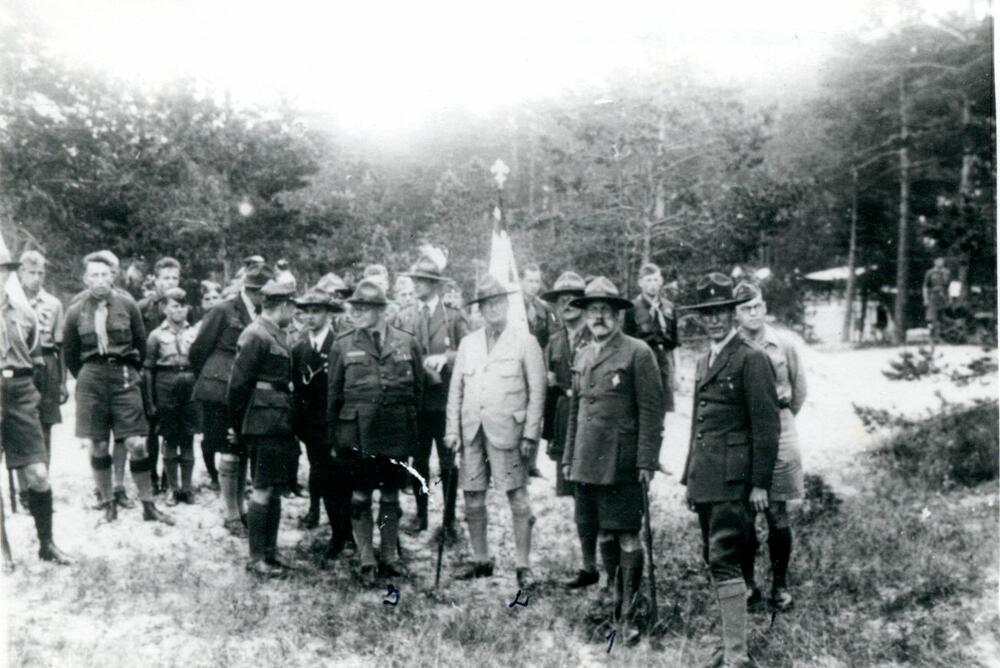 Latvijas skautu 3. Lielās nometnes vadība un viesi nometnes karoga pacelšanas laikā Asaros. 1. rindā no kreisās: 2. Lietuvas skautu un gaidu priekšnieks Valsts prezidenta Antanas Smetonas vietnieks organizācijā Dr. J. Alekna (arī Aļekna), 3. skautu starptautiskā biroja direktors Huberts Stenlijs Martins, 4. skautu vadītājs mežzinis, skautmeistars Eduards Lapiņš (?), 5. Latvijas Skautu centrālās organizācijas centrālās pārvaldes priekšnieks (1921-1940), ģenerālis Kārlis Goppers, 7. nometnes komitejas sekretārs Aleksandrs Osis.