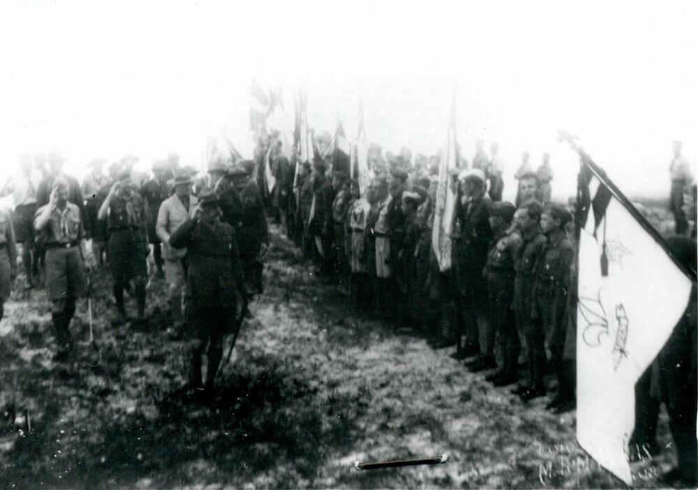 Latvijas skautu 3. Lielās nometnes vadība un viesi skautu ierindas apgaitas laikā, nometnes karoga pacelšanas ceremonijā. Priekšplānā no kreisās Latvijas Skautu centrālās organizācijas centrālās pārvaldes priekšnieks (1921-1940), ģenerālis Kārlis Goppers. 1. rindā no kreisās: 1. Latvijas Skautu priekšnieks un nometnes komandants Teodors Baltpurviņš, 2. Latvijas skautu priekšnieks un 3. Lielās nometnes priekšnieks Jāzeps Dombrovskis, 3. skautu starptautiskā biroja direktors Huberts Stenlijs Martins, 4. skautu vadītājs mežzinis, skautmeistars Eduards Lapiņš (?). No labās skautu karogs ar heraldisko liliju.