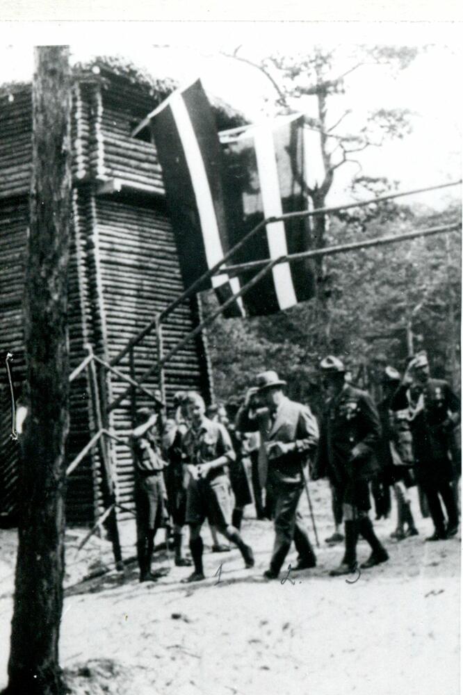 Latvijas Republikas valsts prezidenta Alberta Kvieša, valdības, diplomātiskā korpusa un nometnes goda komitejas ierašnās Latvijas skautu 3. Lielajā nometnē Asaros. No kreisās: 1. Latvijas Skautu priekšnieks un nometnes komandants Teodors Baltpurviņš, 2. Alberts Kviesis, 3. Latvijas Skautu centrālās organizācijas centrālās pārvaldes priekšnieks (1921-1940), ģenerālis Kārlis Goppers. Fonā guļbaļķu tornis ar valsts karogiem.