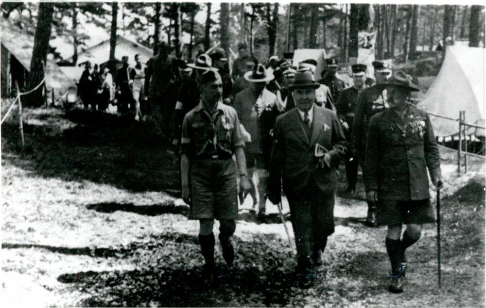 Latvijas Republikas Valsts prezidenta Alberta Kvieša, militāro, diplomātisko pārstāvju un skautu vadības ierašanās Latvijas skautu 3. Lielajā nometnē Asaros. 1. rindā no kreisās: 1. Latvijas Skautu priekšnieks un nometnes komandants Teodors Baltpurviņš, 2. Alberts Kviesis, 3. Latvijas Skautu centrālās organizācijas centrālās pārvaldes priekšnieks (1921-1940), ģenerālis Kārlis Goppers. 2. rindā no kreisās: 1. skautu vadītājs mežzinis, skautmeistars Eduards Lapiņš (?), 2. skautu starptautiskā biroja direktors Huberts Stenlijs Martins, 4. Armijas štāba priekšnieks (02.1934.-10.1939.), ģenerālis Mārtiņš Hartmanis.