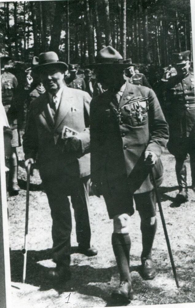 Latvijas Valsts prezidenta Alberta Kvieša, valdības pārstāvju, diplomātiskā korpusa un nometnes goda komitejas ierašanās, Latvijas skautu 3. Lielajā nometnē Asaros. No kreisās: 1. Alberts Kviesis, 2. Latvijas Skautu centrālās organizācijas centrālās pārvaldes priekšnieks (1921-1940), ģenerālis Kārlis Goppers. Fonā no labās Rīgas garnizona priekšnieks, Latvijas armijas komandieris (1934-1940) ģenerālis Krišjānis Berķis.