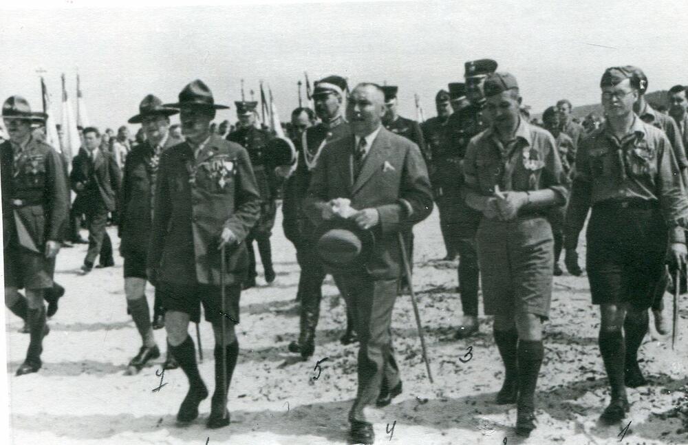 Latvijas Valsts prezidents Alberts Kviesis, militārie, diplomātiskie pārstāvji un skautu vadība pieņem Latvijas skautu 3. Lielās nometnes parādi Asaros. Priekšplānā no kreisās: 1. Latvijas Skautu centrālās organizācijas centrālās pārvaldes priekšnieks (1921-1940), ģenerālis Kārlis Goppers, 2. Alberts Kviesis, 3. Lielupes skautu novada priekšnieks vadītājs Pēteris Vīlips, 4. nometnes komitejas sekretārs Aleksandrs Osis. 2. rindā no kreisās: 1. skautu vadītājs mežzinis, skautmeistars Eduards Lapiņš (?), 2. skautu starptautiskā biroja direktors Huberts Stenlijs Martins, 3. Armijas štāba priekšnieks (02.1934.-10.1939.), ģenerālis Mārtiņš Hartmanis, 4. Rīgas garnizona priekšnieks, Latvijas armijas komandieris (1934-1940) ģenerālis Krišjānis Berķis. 3. rindā no labās iekšlietu ministra biedrs (1934-1937) Alfrēds Jēkabs Bērziņš.