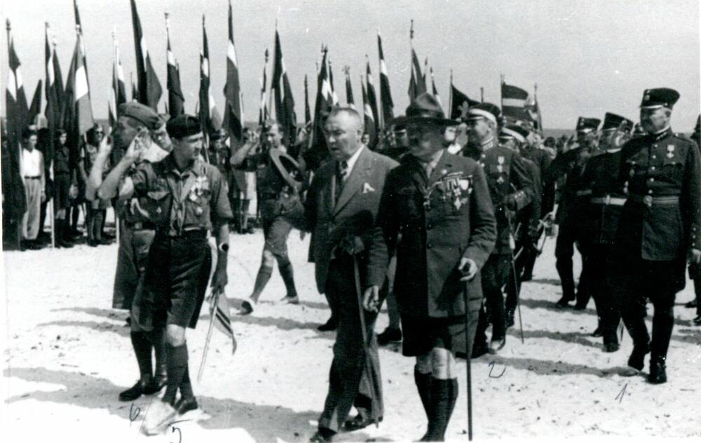 Latvijas Republikas Valsts prezidents Alberts Kviesis, militārie, diplomātiskie pārstāvji pieņem Latvijas skautu 3. Lielās nometnes atklāšanas parādi Asaros. 1. rindā no kreisās: 1. Latvijas Skautu priekšnieks un nometnes komandants Teodors Baltpurviņš, 2. Latvijas skautu priekšnieks un 3. Lielās nometnes priekšnieks Jāzeps Dombrovskis, 3. Alberts Kviesis, 4. Latvijas Skautu centrālās organizācijas centrālās pārvaldes priekšnieks (1921-1940), ģenerālis Kārlis Goppers. 2. rindā no kreisās: 1. nometnes komitejas sekretārs Aleksandrs Osis, 2. Armijas štāba priekšnieks (02.1934.-10.1939.), ģenerālis Mārtiņš Hartmanis, 3. Rīgas garnizona priekšnieks, Latvijas armijas komandieris (1934-1940) ģenerālis Krišjānis Berķis. Fonā valsts karogi.