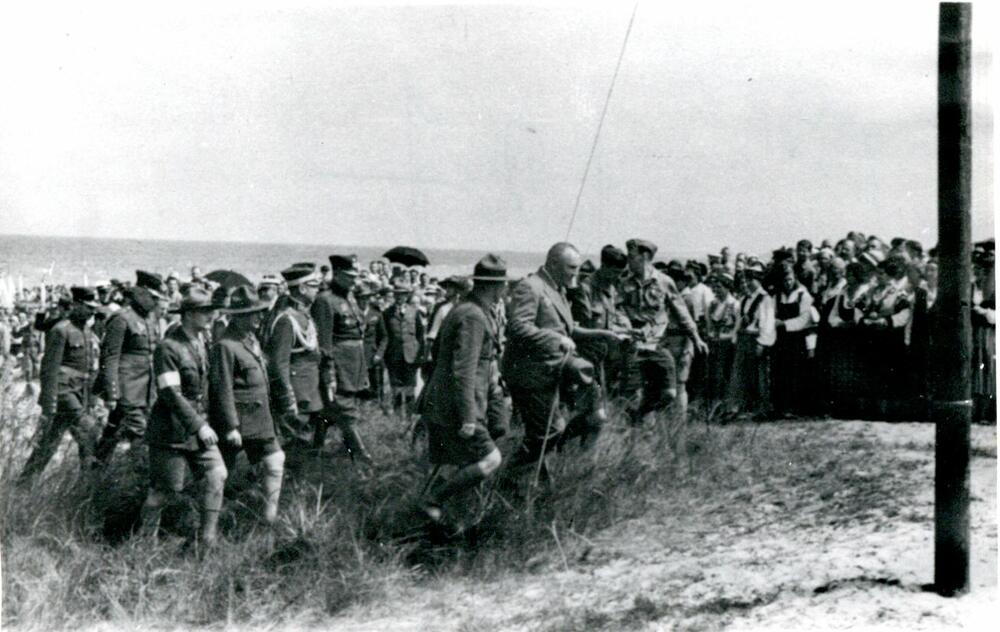 Latvijas Republikas valsts prezidents Alberts Kviesis, militārie, diplomātiskie pārstāvji, skautu vadība Latvijas skautu 3. Lielās nometnes atklāšanas parādē Asaru kāpās. 1. rindā no kreisās: 1. Latvijas Skautu centrālās organizācijas centrālās pārvaldes priekšnieks (1921-1940), ģenerālis Kārlis Goppers, 2. Alberts Kviesis, 3. Latvijas Skautu priekšnieks un nometnes komandants Teodors Baltpurviņš, 4. nometnes komitejas sekretārs Aleksandrs Osis. 2. rindā no kreisās: 1. skautu vadītājs mežzinis, skautmeistars Eduards Lapiņš (?), 2. skautu starptautiskā biroja direktors Huberts Stenlijs Martins, 3. Armijas štāba priekšnieks (02.1934.-10.1939.), ģenerālis Mārtiņš Hartmanis, 4. Rīgas garnizona priekšnieks, Latvijas armijas komandieris (1934-1940) ģenerālis Krišjānis Berķis.