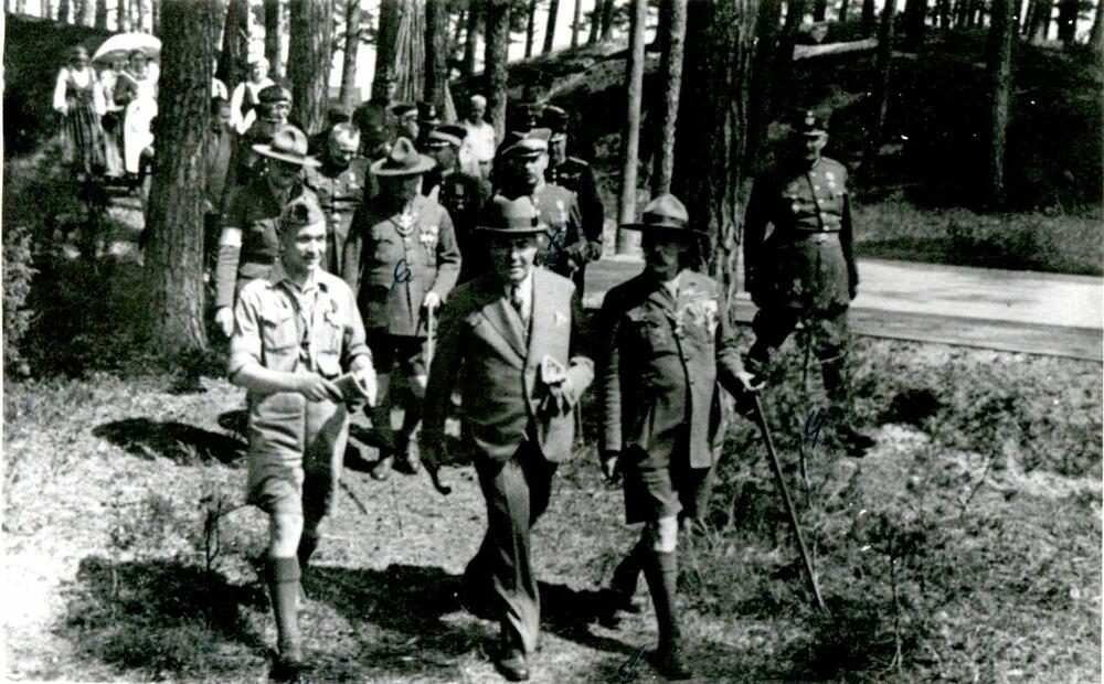 Latvijas Republikas valsts prezidents Alberts Kviesis, militārie, diplomātiskie pārstāvji ierodas Latvijas skautu 3. Lielajā nometnē Asaros. 1. rindā no kreisās: 1. Latvijas Skautu priekšnieks un nometnes komandants Teodors Baltpurviņš, 2. Alberts Kviesis, 3. Latvijas Skautu centrālās organizācijas centrālās pārvaldes priekšnieks (1921-1940), ģenerālis Kārlis Goppers. 2. rindā no kreisās: 1. skautu vadītājs mežzinis, skautmeistars Eduards Lapiņš (?), 2. skautu starptautiskā biroja direktors Huberts Stenlijs Martins, 3. Armijas štāba priekšnieks (02.1934.-10.1939.), ģenerālis Mārtiņš Hartmanis, 4. Rīgas garnizona priekšnieks, Latvijas armijas komandieris (1934-1940) ģenerālis Krišjānis Berķis.