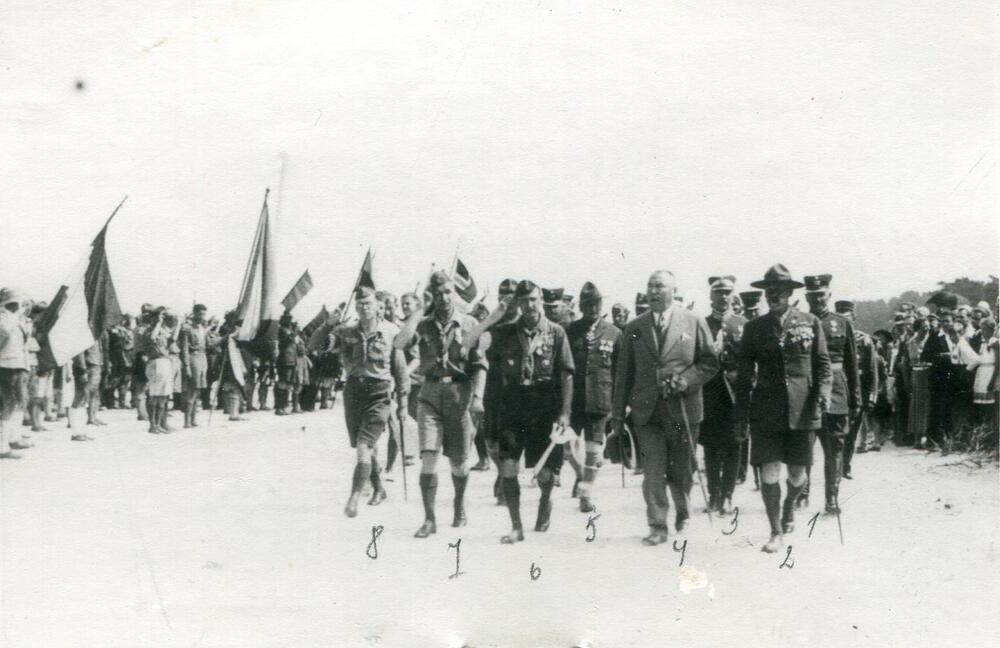 Latvijas Republikas Valsts prezidents Alberts Kviesis, militārie, diplomātiskie pārstāvji un skautu vadība pieņem Latvijas skautu 3. Lielās nometnes atklāšanas parādi Asaros. 1. rindā no kreisās: 1. nometnes komitejas sekretārs Aleksandrs Osis, 2. Latvijas Skautu priekšnieks un nometnes komandants Teodors Baltpurviņš, 3. Latvijas skautu priekšnieks un 3. Lielās nometnes priekšnieks Jāzeps Dombrovskis, 4. Alberts Kviesis, 5. Latvijas Skautu centrālās organizācijas centrālās pārvaldes priekšnieks (1921-1940), ģenerālis Kārlis Goppers. 2. rindā no kreisās: 1. skautu starptautiskā biroja direktors Huberts Stenlijs Martins, 2. Armijas štāba priekšnieks (02.1934.-10.1939.), ģenerālis Mārtiņš Hartmanis, 3. Rīgas garnizona priekšnieks, Latvijas armijas komandieris (1934-1940) ģenerālis Krišjānis Berķis.