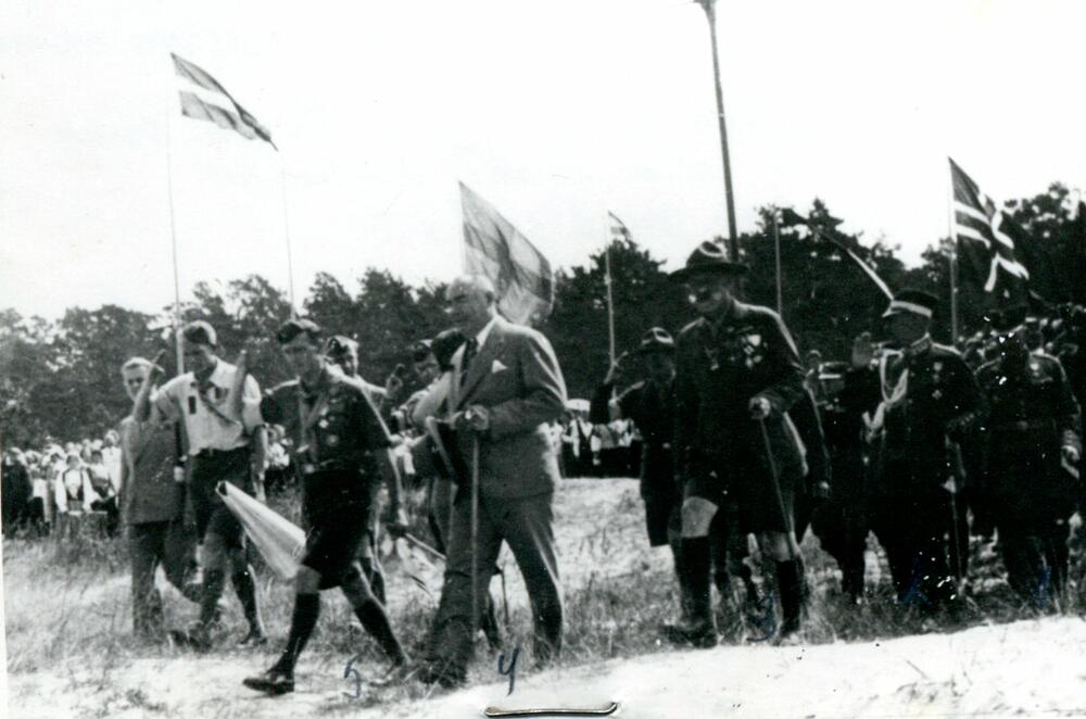 Latvijas Republikas Valsts prezidents Alberts Kviesis, militārie, diplomātiskie pārstāvji un skautu vadība pieņem Latvijas skautu 3. Lielās nometnes atklāšanas parādi Asaros. No kreisās: 3. Latvijas skautu priekšnieks un 3. Lielās nometnes priekšnieks Jāzeps Dombrovskis, 4. Alberts Kviesis, 5. Latvijas Skautu centrālās organizācijas centrālās pārvaldes priekšnieks (1921-1940), ģenerālis Kārlis Goppers, 6. Armijas štāba priekšnieks (02.1934.-10.1939.), ģenerālis Mārtiņš Hartmanis, 7. Rīgas garnizona priekšnieks, Latvijas armijas komandieris (1934-1940) ģenerālis Krišjānis Berķis.