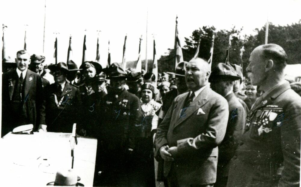 Latvijas Republikas Valsts prezidents Alberts Kviesis uzrunā Latvijas skautu 3. Lielās nometnes atklāšanas parādes dalībniekus Asaros. 1. rindā no kreisās: 1. Igaunijas skautu pārstāvis mācītājs Kāziks (Kuusik), 2. Lietuvas skautu un gaidu priekšnieks Valsts prezidenta Antanas Smetonas vietnieks organizācijā Dr. J. Alekna (arī Aļekna), 3. Polijas skautu prezidents Dr. M. Gražinskis, 4. Lietuvas skautu priekšnieks, pulkvedis Juozas Šaurauskas, 6. Alberts Kviesis, 7. Latvijas Skautu centrālās organizācijas centrālās pārvaldes priekšnieks (1921-1940), ģenerālis Kārlis Goppers. 2. rindā no kreisās: 3. Latvijas Skautu priekšnieks un nometnes komandants Teodors Baltpurviņš, 4. Skautu draugu komitejas priekšniece, Kārļa Goppera kundze Vera Goppere (dzimusi Pajevska), 5. skautu vadītājs mežzinis, skautmeistars Eduards Lapiņš (?), 6. skautu starptautiskā biroja direktors Huberts Stenlijs Martins.