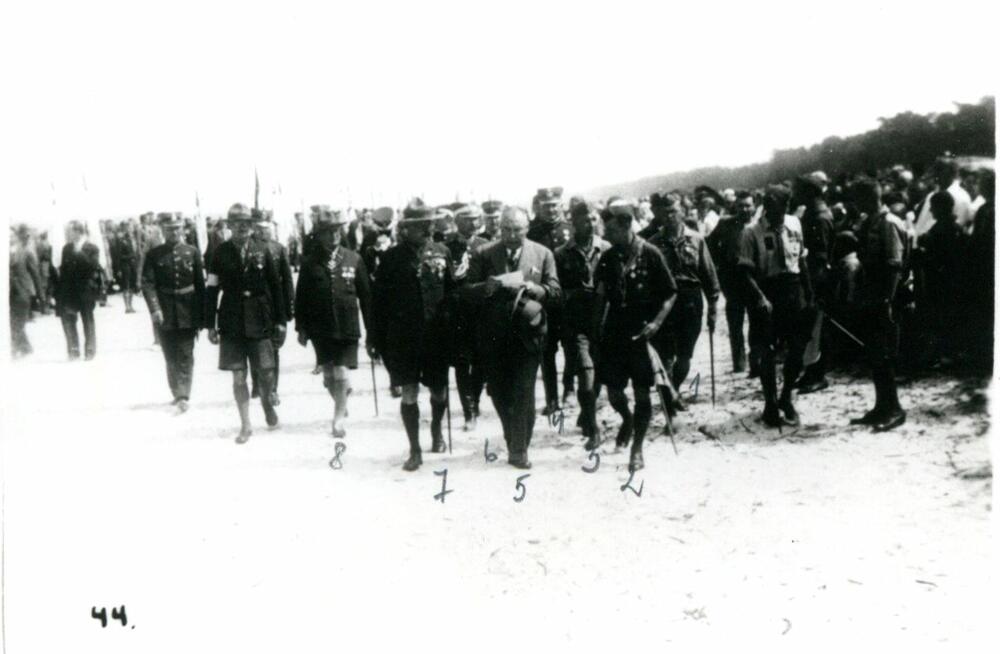 Latvijas Republikas Valsts prezidents Alberts Kviesis, militārie, diplomātiskie pārstāvji un skautu vadība pieņem Latvijas skautu 3. Lielās nometnes atklāšanas parādi Asaros. 1. rindā no kreisās: 1. Latvijas Skautu centrālās organizācijas centrālās pārvaldes priekšnieks (1921-1940), ģenerālis Kārlis Goppers, 2. Alberts Kviesis, 3. Latvijas skautu priekšnieks un 3. Lielās nometnes priekšnieks Jāzeps Dombrovskis. 2. rindā no kreisās: 2. skautu vadītājs mežzinis, skautmeistars Eduards Lapiņš (?), 3. skautu starptautiskā biroja direktors Huberts Stenlijs Martins, 4. Armijas štāba priekšnieks (02.1934.-10.1939.), ģenerālis Mārtiņš Hartmanis, 5. Rīgas garnizona priekšnieks, Latvijas armijas komandieris (1934-1940) ģenerālis Krišjānis Berķis, 6. Latvijas Skautu priekšnieks un nometnes komandants Teodors Baltpurviņš, 7. nometnes komitejas sekretārss Aleksandrs Osis.