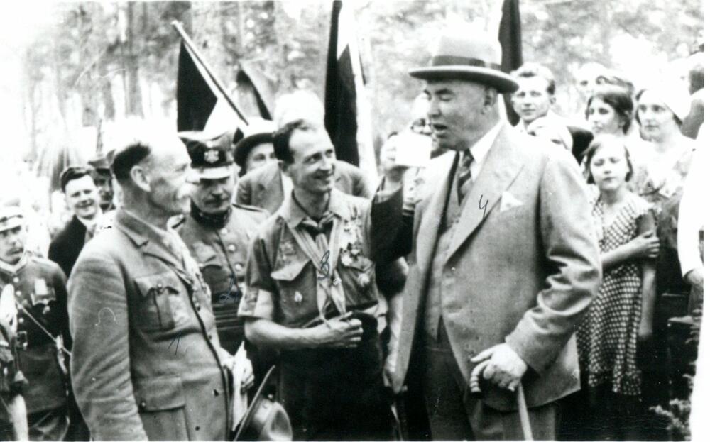 Latvijas Republikas Valsts prezidents Alberts Kviesis, armijas, valdības un diplomātiskie pārstāvji viesojas Latvijas skautu 3. Lielajā nometnē Asaros. Centrā no kreisās: 1. Latvijas Skautu centrālās organizācijas centrālās pārvaldes priekšnieks (1921-1940), ģenerālis Kārlis Goppers, 2. Rīgas garnizona priekšnieks, Latvijas armijas komandieris (1934-1940) ģenerālis Krišjānis Berķis, 2. Latvijas Skautu priekšnieks un nometnes komandants Teodors Baltpurviņš, 3. Alberts Kviesis.