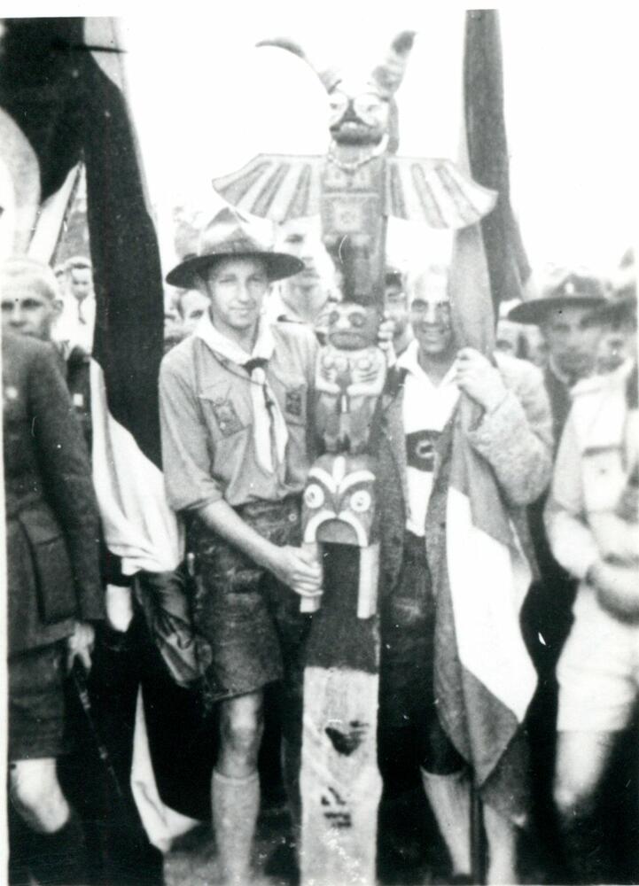 Latvijas skautu 3. Lielās nometnes Asaros noslēguma diena. Labākie nometnes skauti no Austrijas ar Latvijas Republikas izglītības ministra Ludviga Ernesta Adamoviča dāvāto totēmu, kuru izgatavojuši Liepājas skauti.