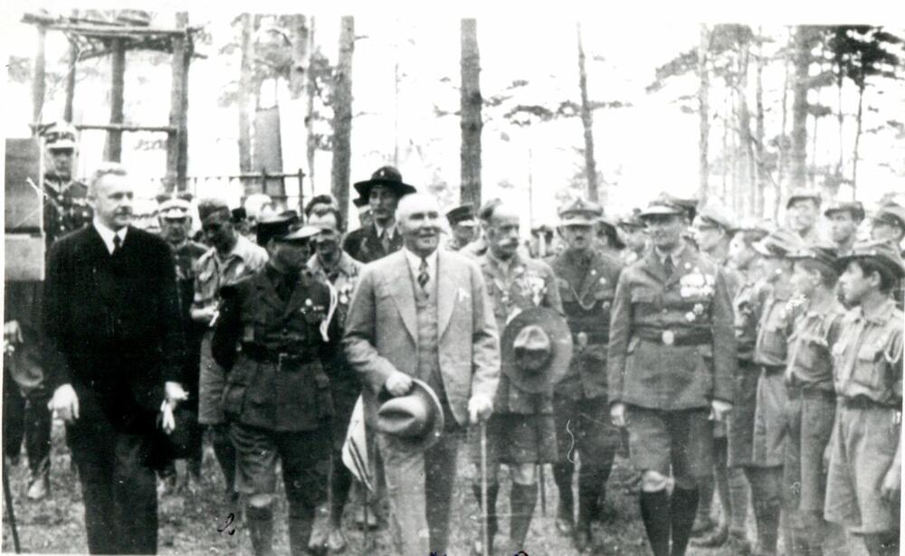 Latvijas Republikas valsts prezidenta Alberta Kvieša, valdības, diplomātiskā korpusa un nometnes goda komitejas locekļu vizīte Latvijas skautu 3. Lielajā nometnē Asaros. Alberts Kviesis apmeklē Polijas skautu vienību, 1. rindā no kreisās: 1. Polijas sūtnis Latvijā Z. Bečkovičs, 2. Polijas skautu prezidents, Zakopanes vojevoda Dr. M. Gražinskis, 3. Alberts Kviesis. No kreisās: 2. Rīgas garnizona priekšnieks, Latvijas armijas komandieris (1934-1940) ģenerālis Krišjānis Berķis, 3. Latvijas Skautu priekšnieks un nometnes komandants Teodors Baltpurviņš, 4. Latvijas skautu priekšnieks un 3. Lielās nometnes priekšnieks Jāzeps Dombrovskis, 5. Latvijas Skautu centrālās organizācijas centrālās pārvaldes priekšnieks (1921-1940), ģenerālis Kārlis Goppers, 6. skautu vadītājs mežzinis, skautmeistars Eduards Lapiņš (?).