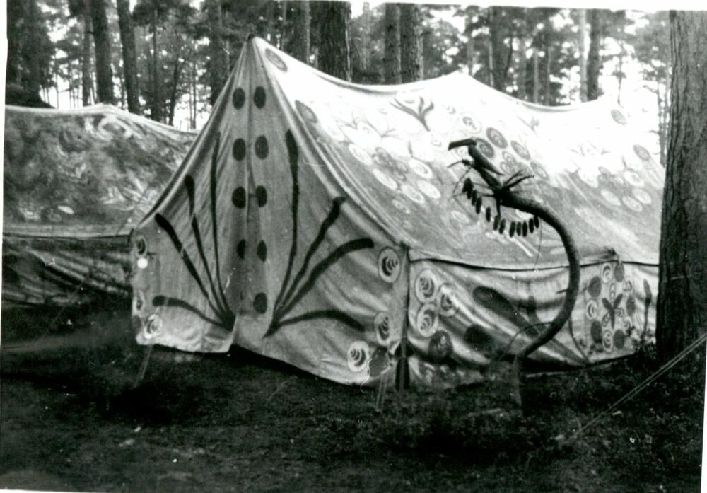 Latvijas skautu 3. Lielā nometne Asaros. Poļu skautu nometnes ar ornamentiem izkrāsotās teltis.