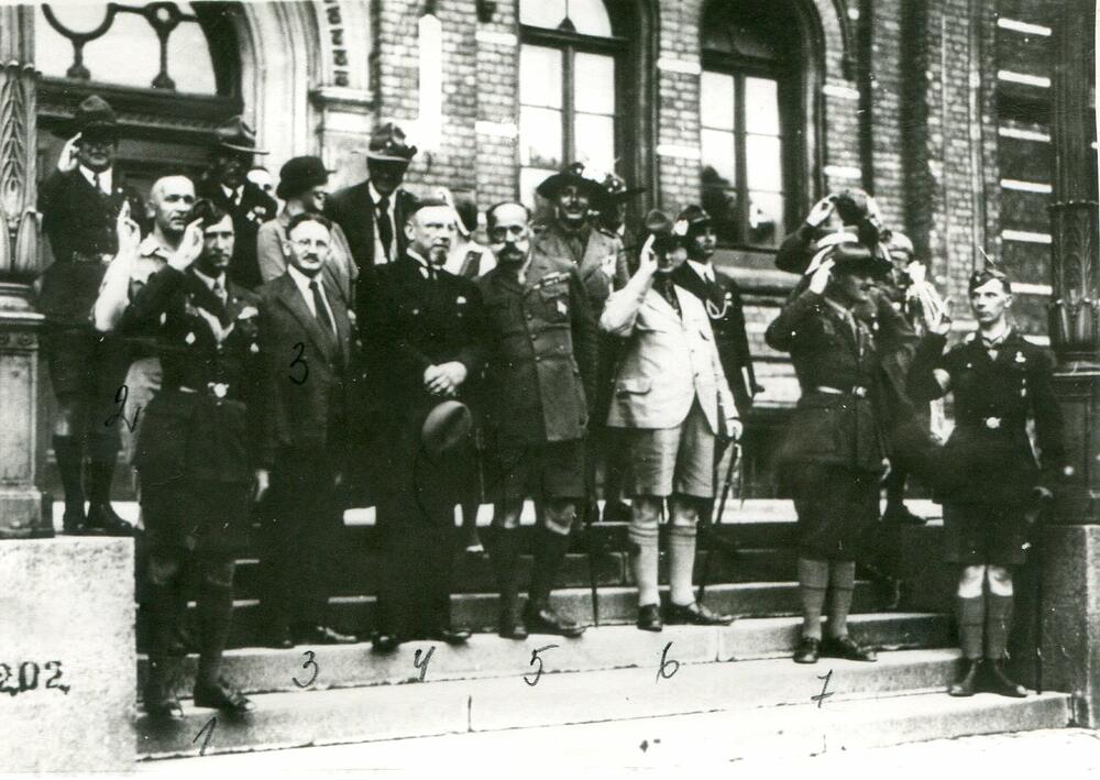 Latvijas skautu 3. Lielās nometnes dalībnieku parāde Rīgā. Uz Latvijas Universitātes kāpnēm, parādi pieņem: 1. Latvijas skautu priekšnieks un 3. Lielās nometnes priekšnieks Jāzeps Dombrovskis, 2. izglītības ministrs Ludvigs Ernests Adamovičs, 3. Ministru prezidenta biedrs Marģers Skujenieks, 4. Latvijas Skautu centrālās organizācijas centrālās pārvaldes priekšnieks (1921-1940), ģenerālis Kārlis Goppers, 5. skautu starptautiskā biroja direktors Huberts Stenlijs Martins, 6. skautu vadītājs mežzinis, skautmeistars Eduards Lapiņš (?). 2. rindā no kreisās 1. Latvijas Skautu priekšnieks un nometnes komandants Teodors Baltpurviņš. Grupas foto.