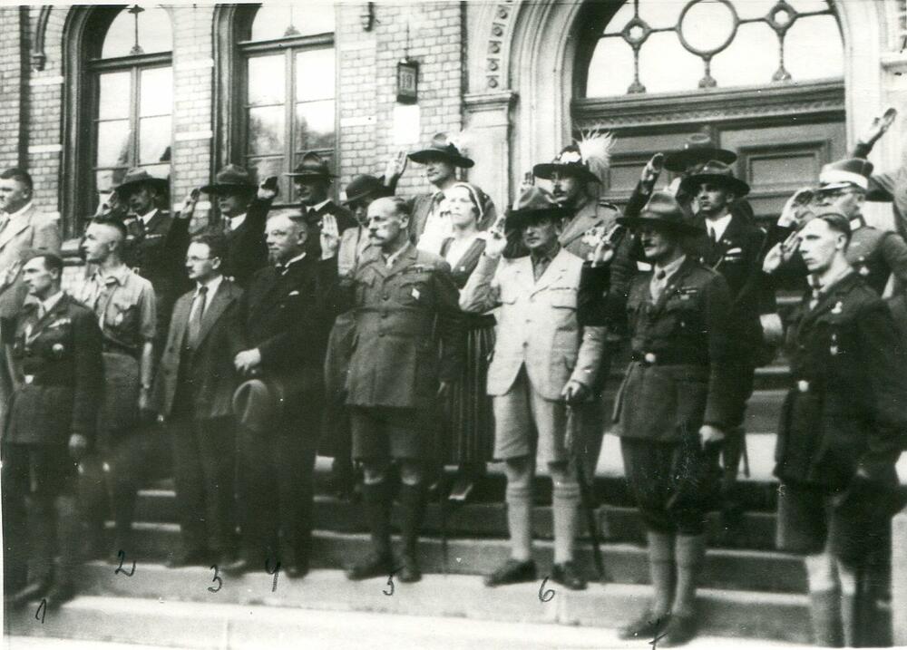 Latvijas skautu 3. Lielās nometnes dalībnieku parāde Rīgā. Uz Latvijas Universitātes kāpnēm parādi vēro oficiālas personas un ārvalstu skautu vadītāji. Parādi pieņem (no kreisās): 1. Latvijas skautu priekšnieks un 3. Lielās nometnes priekšnieks Jāzeps Dombrovskis, 2. izglītības ministrs Ludvigs Ernests Adamovičs, 3. Ministru prezidenta biedrs Marģers Skujenieks, 4. Latvijas Skautu centrālās organizācijas centrālās pārvaldes priekšnieks (1921-1940), ģenerālis Kārlis Goppers, 5. skautu starptautiskā biroja direktors Huberts Stenlijs Martins, 6. skautu vadītājs mežzinis, skautmeistars Eduards Lapiņš (?). 2. rindā no kreisās: 1. iekšlietu ministra biedrs (1934-1937) Alfrēds Jēkabs Bērziņš, 2. Latvijas Skautu priekšnieks un nometnes komandants Teodors Baltpurviņš, 3. nometnes goda komitejas locekle, izdevēja, redaktore, sabiedriskā darbiniece Emīlija Benjamiņa, 4. Skautu draugu komitejas priekšnieces vietnieces Em. Zauera kundzes palīdze A. Kārkliņa. Grupas foto.