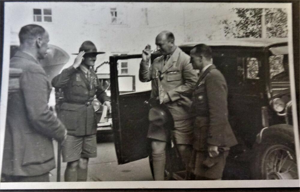 Latvijas skautu 3. Lielā nometne pārstāvju ierašanās Latvijas Republikas Valsts prezidenta pilī. No kreisās: 1. Latvijas Skautu centrālās organizācijas centrālās pārvaldes priekšnieks (1921-1940), ģenerālis Kārlis Goppers, 2. skautu vadītājs mežzinis, skautmeistars Eduards Lapiņš (?), 3. skautu starptautiskā biroja direktors Huberts Stenlijs Martins, 4. Latvijas skautu priekšnieks un 3. Lielās nometnes priekšnieks Jāzeps Dombrovskis.