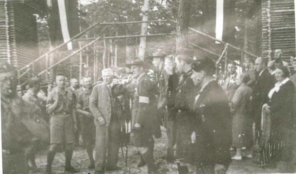 Latvijas Valsts un Ministru prezidents Kārlis Ulmanis viesojas Latvijas skautu 3. Lielajā nometnē Asaros. Centrā (zem karoga) no kreisās: 1. Latvijas Skautu priekšnieks un nometnes komandants Teodors Baltpurviņš, 2. Latvijas skautu priekšnieks un 3. Lielās nometnes priekšnieks Jāzeps Dombrovskis, 3. Kārlis Ulmanis. Priekšplānā no kreisās 1. nometnes komitejas sekretārs Aleksandrs Osis. Pagaidu guļbaļķu ēkas rotātas ar valsts karogiem.