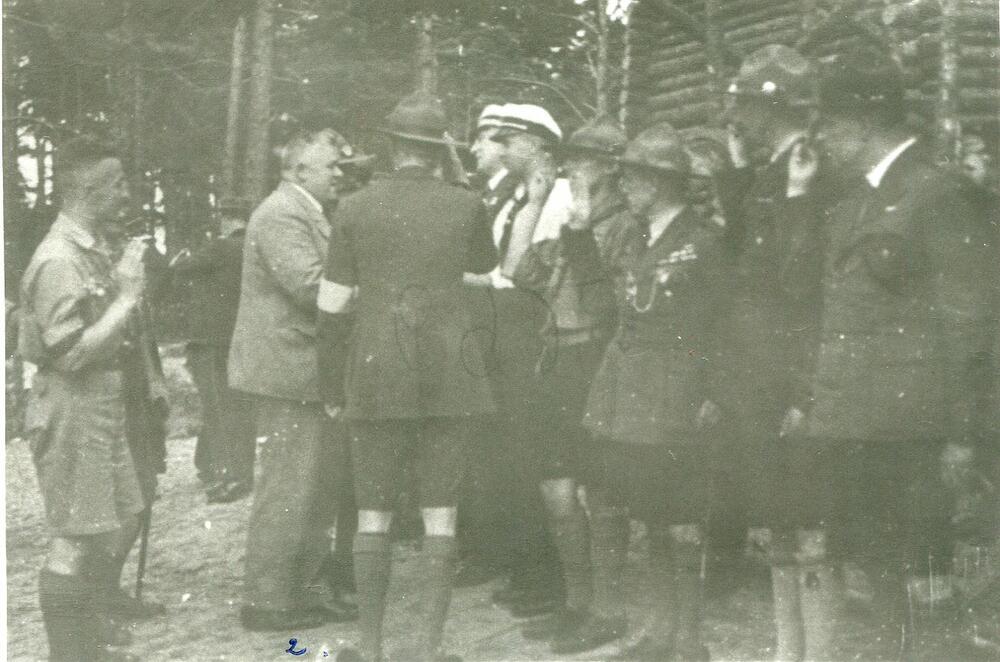 Latvijas Valsts un Ministru prezidents Kārlis Ulmanis viesojas Latvijas skautu 3. Lielajā nometnē Asaros. No kreisās: 1. Latvijas Skautu priekšnieks un nometnes komandants Teodors Baltpurviņš, 2. Kārlis Ulmanis, 3. Latvijas Skautu centrālās organizācijas centrālās pārvaldes priekšnieks (1921-1940), ģenerālis Kārlis Goppers.