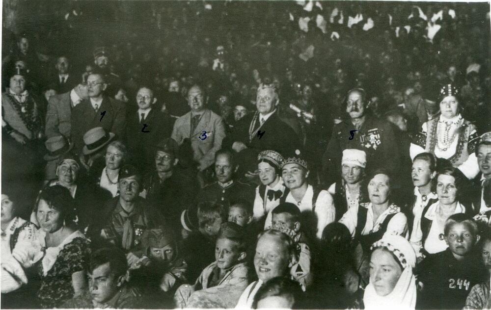 Latvijas skautu 3. Lielajā nometnē Asaros, viesojas Latvijas Valsts un Ministru prezidents Kārlis Ulmanis un oficiālas personas. 2. rindā no kreisās 2. Latvijas skautu priekšnieks un 3. Lielās nometnes priekšnieks Jāzeps Dombrovskis. 3. rindā no kreisās 2. skautu vadītājs mežzinis, skautmeistars Eduards Lapiņš (?). 4. rindā no kreisās: 1. Skautu draugu komitejas priekšnieces vietniece Em. Zauera kundze, 3. iekšlietu ministrs Vilis Gustavs Gulbis, 4. izglītības ministrs Ludvigs Ernests Adamovičs, 5. skautu starptautiskā biroja direktors Huberts Stenlijs Martins, 6. Kārlis Ulmanis, 7. Latvijas Skautu centrālās organizācijas centrālās pārvaldes priekšnieks (1921-1940), ģenerālis Kārlis Goppers, 8. Skautu draugu komitejas priekšniece, Kārļa Goppera kundze Vera Goppere (dzimusi Pajevska). Grupas foto.