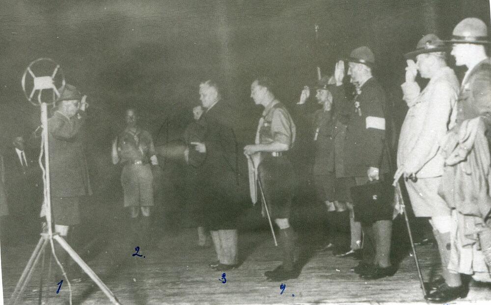 Latvijas Skautu centrālās organizācijas centrālās pārvaldes priekšnieks (1921-1940), ģenerālis Kārlis Goppers sveic Latvijas Valsts un Ministru prezidentu Kārli Ulmani, Latvijas skautu 3. Lielās nometnes atklāšanā Asaros. No kreisās: 1. Kārlis Goppers, 2. Latvijas Skautu priekšnieks un nometnes komandants Teodors Baltpurviņš, 3. Kārlis Ulmanis, 4. Latvijas skautu priekšnieks un 3. Lielās nometnes priekšnieks Jāzeps Dombrovskis. No labās 2. skautu starptautiskā biroja direktors Huberts Stenlijs Martins.