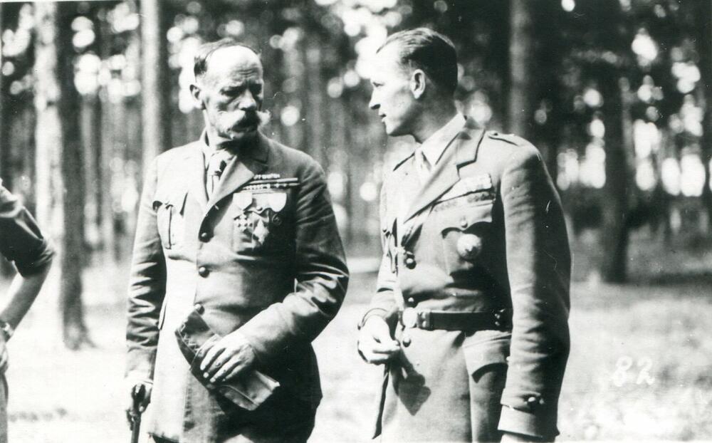 Latvijas Skautu centrālās organizācijas centrālās pārvaldes priekšnieks (1921-1940), ģenerālis Kārlis Goppers tiekas ar Latvijas skautu priekšnieku un 3. Lielās nometnes priekšnieku Jāzepu Dombrovski, Latvijas skautu 3. Lielās nometnes laikā Asaros. No kreisās: 1. Kārlis Goppers, 2. Jāzeps Dombrovskis.