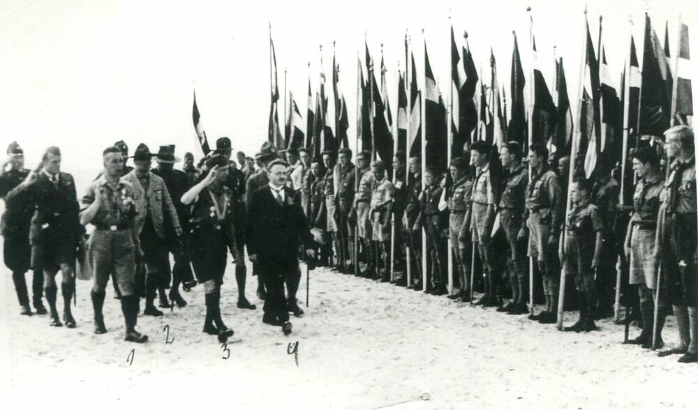 Latvijas skautu 3. Lielās nometnes slēgšanas parādi Asaros pieņem izglītības ministrs Ludvigs Ernests Adamovičs, valdības, diplomātiskā korpusa un skautu vadības pārstāvji. 1. rindā no kreisās: 1. Latvijas Skautu priekšnieks un nometnes komandants Teodors Baltpurviņš, 2. Latvijas skautu priekšnieks un 3. Lielās nometnes priekšnieks Jāzeps Dombrovskis, 3. Ludvigs Ernests Adamovičs. 2. rindā no kreisās: 2. skautu starptautiskā biroja direktors Huberts Stenlijs Martins, 4. Latvijas Skautu centrālās organizācijas centrālās pārvaldes priekšnieks (1921-1940), ģenerālis Kārlis Goppers. Fonā skauti tur Latvijas karogus.