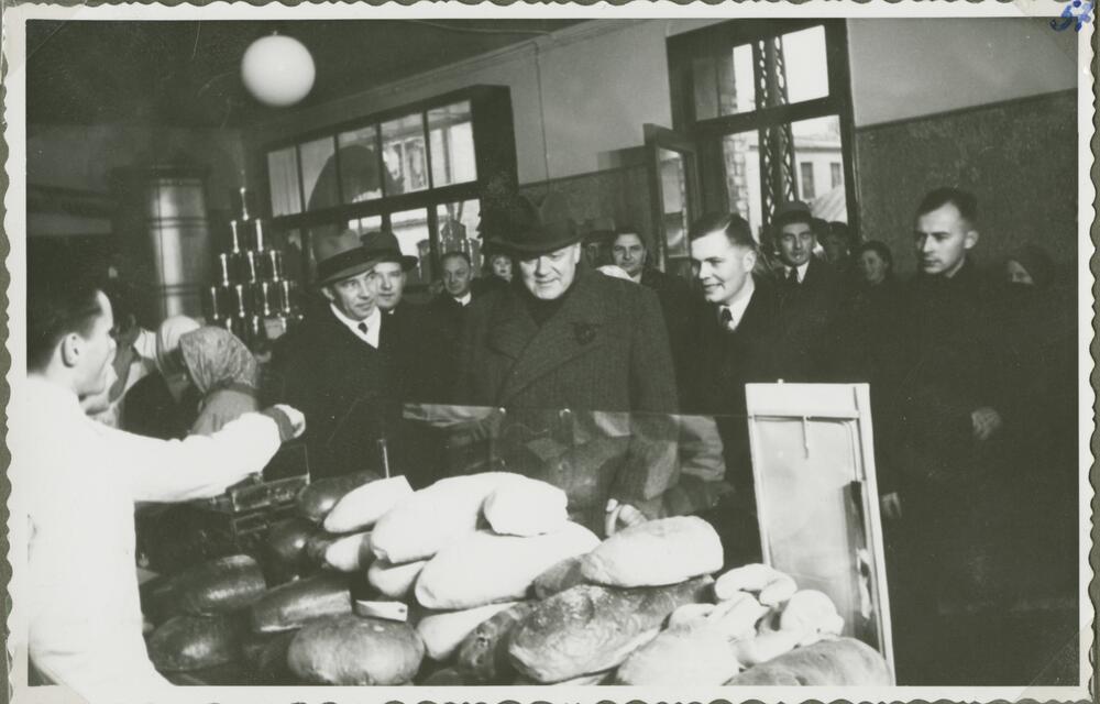 Latvijas Valsts un Ministru prezidents Kārlis Ulmanis (priekšplānā vidū) apmeklē Rīgas patērētāju biedrības "Vienība" 21. pārtikas preču veikalu Brīvības ielā 184a.