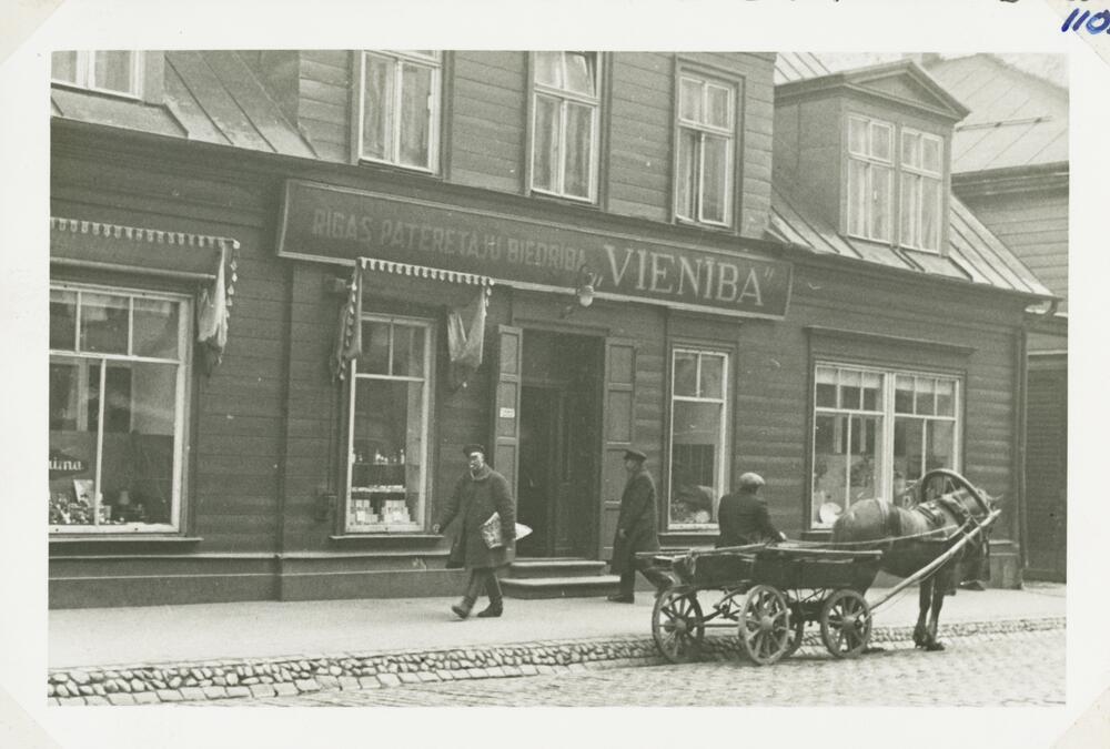 Rīgas patērētāju biedrības "Vienība" 3. saimniecības preču veikals Dzirnavu ielā 81/85. Pie veikala zirga pajūgs.