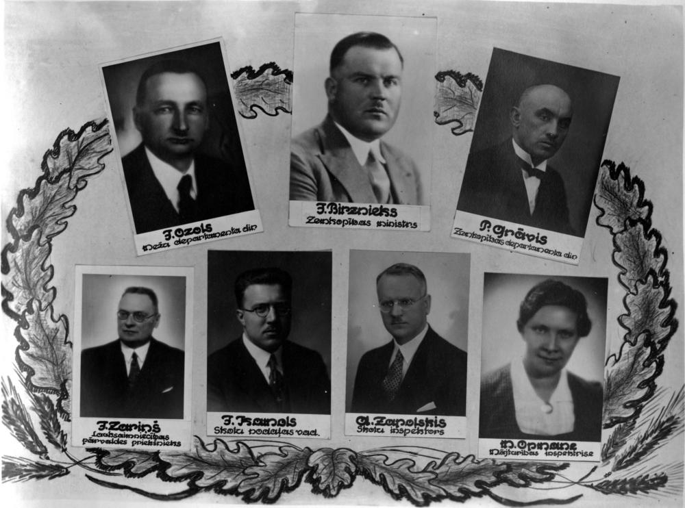 Zemkopības ministrijas darbinieki. Augšējā 1. rindā no kreisās: 1. Zemkopības ministrijas Mežu departamenta direktors Jānis Ozols, 2. zemkopības ministrs Jānis Birznieks, 3. Zemkopības ministrijas Zemkopības departamenta direktors Pēteris Grāvis, 2. rindā no kreisās: 1. Zemkopības ministrijas Lauksaimniecības pārvaldes priekšnieks Jānis Zariņš, 2. Zemkopības ministrijas Zemkopības departamenta skolu nodaļas vadītājs Jānis Rihards Kamols, 3. Zemkopības ministrijas Lauksaimniecības skolu inspektors Aleksandrs Zapoļskis, 4. mājturības inspektore Marija Opmane. Fotomontāža.