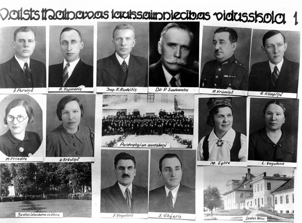 Valsts Malnavas lauksaimniecības vidusskola. Augšējā 1. rindā no kreisās: 1. J. Purviņš, 2. A. Kopmanis, 3. skolas inspektors Kārlis Rudzītis, 4. skolas direktors Pēteris Sauleskalns, 5. skolotājs Rūdolfs Krūmiņš, 6. A. Klimpiņš. 2. rindā no kreisās: 1. M. Priedīte, 2. V. Krēsliņa, 3. skolas pedagogu un audzēkņu kopbilde, 4. M. Eglīte, 5. L. Vagulāne. 3. rindā no kreisās: 1. skats no skolas izlaiduma, 2. J. Vagulāns, 3. J. Ģēģeris, 4. skolas ēka. Fotomontāža.