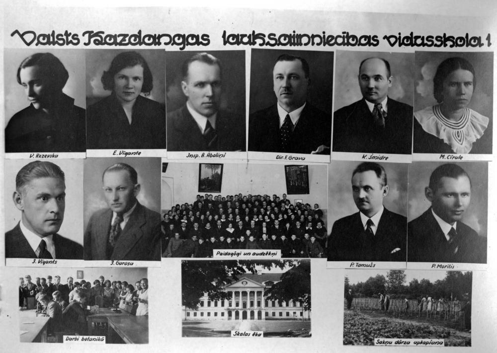 Valsts Kazdangas lauksaimniecības vidusskola. Augšējā 1.rindā no kreisās: 1. V. Rezevska, 2. E. Vīgante, 3. skolas inspektors Arvīds Āboliņš, 4. skolas direktors Fricis Grava, 5. K. Šmidre, 6. M. Cīrule. 2. rindā no kreisās: 1. J. Vīgants, 2. J. Garosa, 3. pasniedzēju un skolnieku kopbilde, 4. P. Tamužs, 5. P. Morīts. 3. rindā no kreisās: 1. nodarbības botānikā, 2. skolas ēka, 3. sakņu dārza uzkopšana. Fotomontāža.