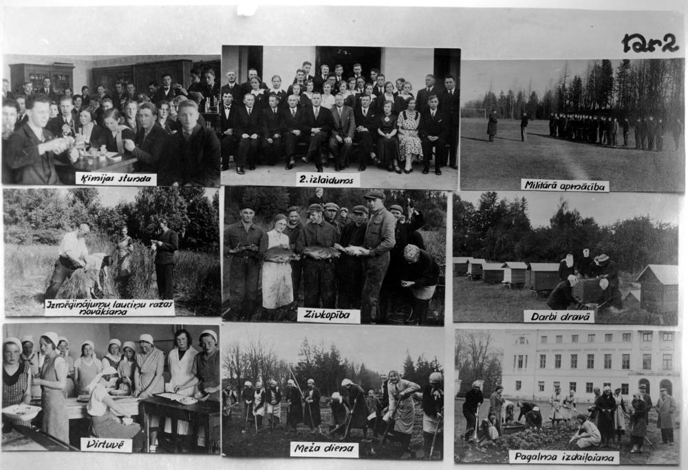 Valsts Kazdangas lauksaimniecības vidusskola. Apakšējā 1. rindā no kreisās: 1. skolas virtuve, 2. meža dienu dalībnieki, 3. skolas pagalma labiekārtošanas darbi. 2. rindā no kreisās: 1. ražas novākšana izmēģinājumu laukā, 2. nodarbības zivkopībā, 3. darbs bišu druvā. 1. rindā no kreisās: 1. audzēkņi un pasniedzēji ķīmijas stundā, 2. skolas izlaidums, 3. militārā apmācība. Fotomontāža.