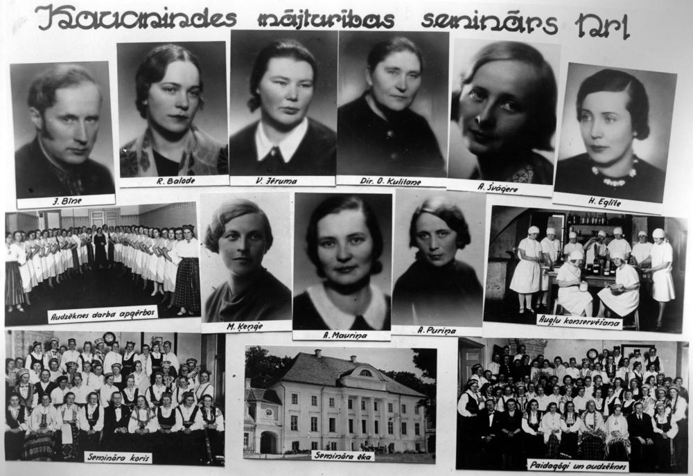 Kaucmindes mājturības seminārs (no 1938. gada 10. jūlija Latvijas Mājturības institūts). 1923. gada 1.oktobrī mācības uzsāka pirmās audzēknes. Augšējā 1. rindā no kreisās: 1. mākslinieks un skolotājs Jēkabs Bīne, 2. R. Balode, 3. V. Jēruma, 4. direktore (no 1927. gada 1. aprīļa) Olga Kulitane (Olga Stakle-Kulitāne, iepriekš skolas skolotāja 1923-1927), 5. skolotāja Anna Švāģere, 6. H. Eglīte. 2. rindā no kreisās: 1. semināra audzēknes darba apģērbā, 2. skolotāja Marija Ķeņģe (Marija Ozoliņa-Keņģe), 3. A. Mauriņa, 4. A. Puriņa, 5. audzēknes konservē augļus. 3. rindā no kreisās: 1. semināra koris tautastērpos, 2. semināra ēka Kaucmindes (Saulaines) pilī, kur atradās Kaucmindes mājturības skola, 3. pedagogi un audzēknes. Fotomontāža.