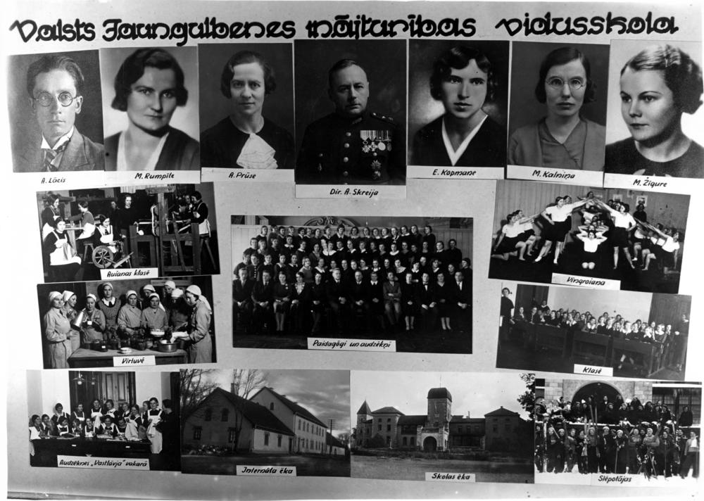 Valsts Jaungulbenes mājturības vidusskola (vēlāk Jaungulbenes arodskola). Dibināta 1927. gada 7. septembrī kā divgadīgā mājturības skola. Augšējā 1. rindā no kreisās: 1. aušanas klasē audzēknes pie stellēm un ratiņa, 2. audzēknes vingro. Ceturtajā rindā no kreisās: 1. A. Lācis, 2. M. Rumpīte, 3. A. Prūse, 4. skolas direktors (1936-1940) Rihards Arvīds Skreija, 5. E. Kopmane, 6. M. Kalniņa, 7. M. Žīgure. Centrā: pedagogi un audzēknes. 2. rindā no kreisās: 1. audzēknes virtuvē, 2. audzēknes klasē. 3. rinda no kreisās: 1. audzēknes Vatslāvja vakarā, 2. internāta ēka, 3. skolas ēka Jaungulbenes pilī, 4. audzēknes slēpotājas. Fotomontāža.