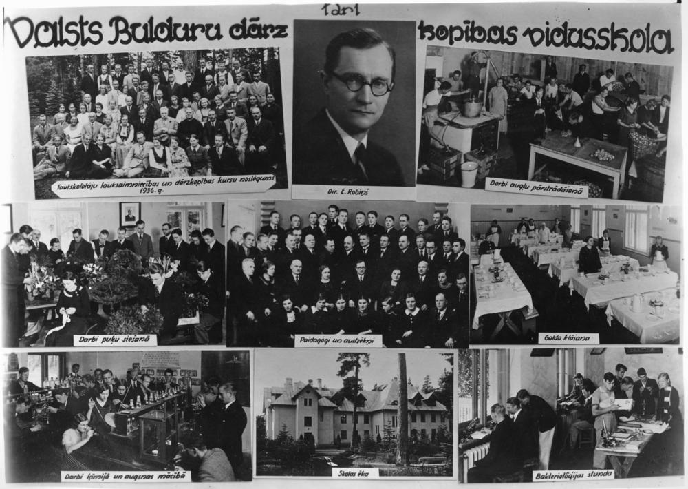 Valsts Bulduru dārzkopības vidusskola. Augšējā 1. rindā no kreisās: 1. tautskolotāju lauksaimniecības un dārzkopības kursu noslēgums 1936. gadā, 2. skolas direktors Jānis Ēriks Robiņš, 3. mācību nodarbība augļu pārstrādāšanā. 2. rindā no kreisās: 1. mācību stunda ziedu kompozīcijas veidošanā, 2. pedagogu un audzēkņu kopbilde, 3. galda klāšanas nodarbība. 3. rindā no kreisās: 1. praktiskā mācību stunda ķīmijā un augsnes mācībā, 2. skolas ēkas kopskats, 3. bakterioloģijas stunda. Fotomontāža.