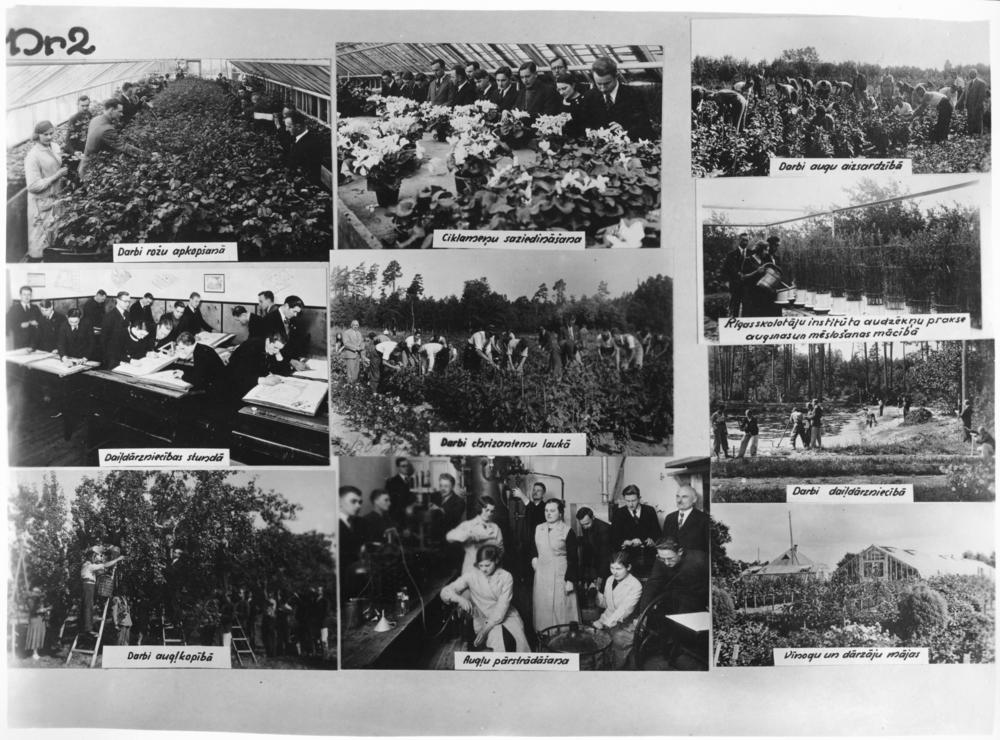 Valsts Bulduru dārzkopības vidusskola. Apakšējā 1. rindā no kreisās: 1. praktiskā nodarbība augļkopībā, 2. augļu pārstrādāšana, 3. vīnogu audžu un dārza mājas. 2. rindā no kreisās: 1. daiļdārzniecības mācību stunda, 2. praktiskā nodarbība krizantēmu laukā, 3. Rīgas skolotāju institūta audzēkņu prakse augsnes un mēslošanas mācībā (augšā), 4. praktiskā nodarbība daiļdārzniecībā (apakšā). 3. rindā no kreisās: 1. praktiskā nodarbība rožu apkopšanā, 2. Ciklamenas ziedu saziedināšana, 3. praktiskā nodarbība augu aizsardzībā. Fotomontāža.