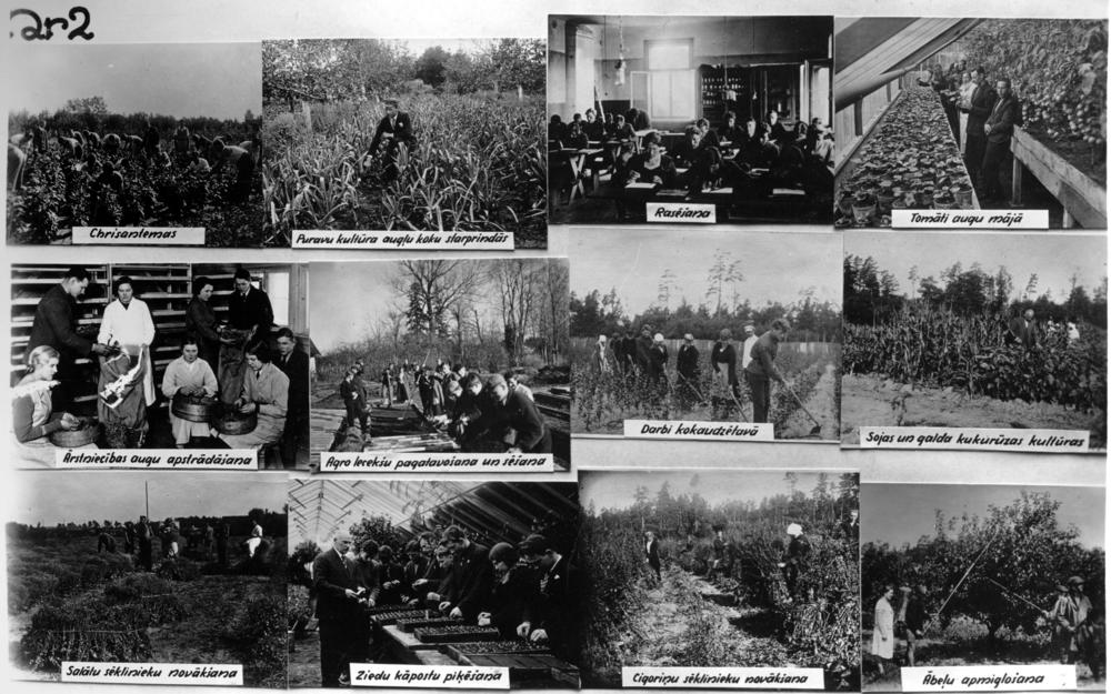 Valsts Bulduru dārzkopības skola. Apakšējā 1. rindā no kreisās: 1. salātu sēklu novākšana, 2. ziedkāpostu piķēšana, 3. cigoriņi sēklinieku novākšana, 4. ābeļu apmiglošana. 2. rindā no kreisās: 1. ārstniecības augu apstrādāšana, 2. agro lecekšu pagatavošana un sēšana, 3. praktiskās nodarbības kokaudzētavā, 4. sojas un galda kukurūzas audzes. 3. rindā no kreisās: 1. krizantēmu lauks, 2. puravu dobes starp augļu kokiem, 3. rasēšanas nodarbība, 4. tomātu siltumnīca. Fotomontāža.