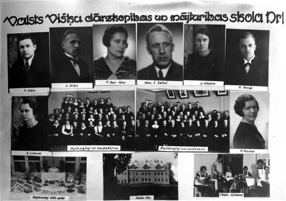 Valsts Višķu dārzkopības un mājturības skola. Augšējā 1. rindā no kreisās: 1. P. Ivdra, 2. L. Kriķis, 3. P. Gari-Jāne, 4. skola pārzinis Emīls Saliņš, 5. L. Vītoliņa, 6. Kārlis Reņģe. 2. rindā no kreisās: 1. A. Leilande, 2. pedagogu un audzēkņu kopbilde, 3. pedagogu un audzēkņu kopbilde, 4. A. Ancāne. 1. rindā no kreisās: 1. bufetes veidā klāts galds, 2. skolas ēka, 3. veļas šūšana. Fotomontāža.
