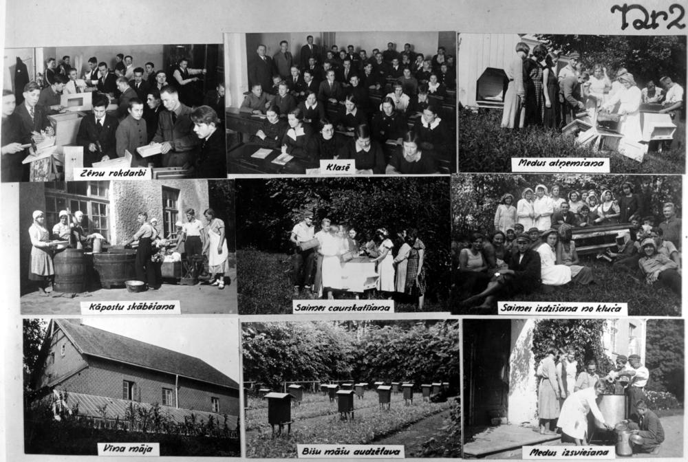 Vecbebru biškopības un dārzkopības skola. Apakšējā 1. rindā no kreisās: 1. vīna māja, 2. bišu drava, 3. medus izsviešana. 2. rindā no kreisās: 1. kāpostu skābēšana, 2. bišu saimes caurskatīšana, 3. bišu saimes dzīšana. 3. rindā no kreisās: 1. zēnu rokdarbu stunda, 2. klase, 3. medus atņemšana. Fotomontāža.