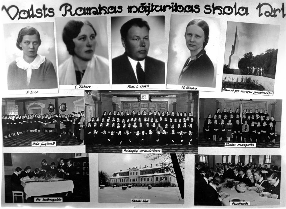 Valsts Rankas mājturības skola (tagad Rankas arodvidusskola). Dibināta 1923. gada 18. jūnijā kā divgadīgā mājturības skola. Augšējā 1. rindā no kreisās: 1. skolotāja A. Līne (arī Līnis), 2.skolotāja E. Zābere (arī Zābers), 3. skolas pārzinis (1929-1941) Eduards Baķis, 4. skolotāja M. Niedra, 5. audzēknes Raunā pie varoņu pieminekļa. 2. rindā no kreisās: 1. rīta lūgšana, 2. pedagogu un audzēkņu kopbilde, 3. skolas mazpulku organizācijas dalībnieku kopbilde. 3. rindā no kreisās: 1. audzēknes pie lasāmgalda, 2. skolas ēka Rankas pilī, 3. audzēknes pusdienās. Fotomontāža.