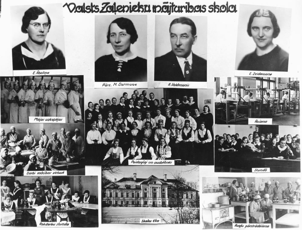 Valsts Zaļenieku mājturības skola (tagad Zaļenieku komerciālā un amatniecības vidusskola). Augšējā 1. rindā no kreisās: 1. skolotāja E. Āboliņa, 2. skolas pārzine Milda Dermane, 3. skolotājs Arvīds Valdmanis, 4. E. Zeidemane. 2. rindā no kreisās: 1. audzēknes mājas uzkopšanas darbos, 2. audzēknes aušanas nodarbībā. 3. rindā no kreisās: 1. praktiskā nodarbība mācību virtuvē, 2. pedagogu un audzēkņu kopbilde, 3. audzēknes stundā. 4. rindā no kreisās: 1. audzēknes rokdarbu stundā, 2. skolas ēka Zaļenieku pilī jeb Zaļajā muižā (arhitekts Severīns Jensens), 3. audzēknes augļu pārstrādāšanas nodarbībā. Fotomontāža.