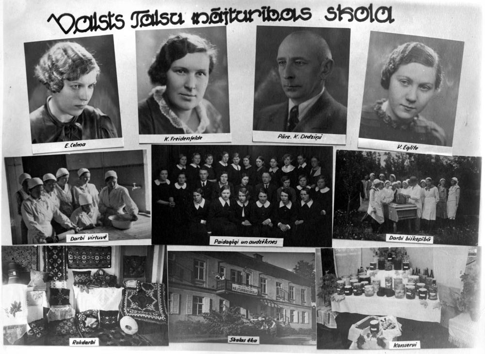Valsts Talsu mājturības skola. Augšējā 1. rindā no kreisās: 1. E. Celma, 2. skolotāja Kristīne Freidenfelde (Freidenfelds), 3. skolas pārzinis Kārlis Dedziņš, 4. skolotāja Valentīne Eglīte. 2. rindā no kreisās: 1. audzēknes darbos virtuvē, 2. pedagogu un audzēkņu kopbilde, 3. audzēknes darbos biškopībā. 3. rindā no kreisās: 1. rokdarbi, 2. skolas ēka (Cirķeļa nams), 3. konservi burkās. Fotomontāža.
