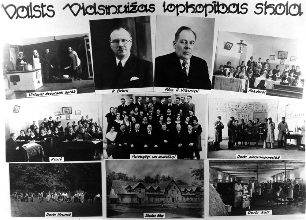 Valsts Vidsmuižas lopkopības skola. Augšējā 1. rindā no kreisās: 1. virtuves dežuranti darbā, 2. K. Bebris, 3. skolas pārzinis Alfrēds Vīksniņš, 4. rokdarbu nodarbība. 2. rindā no kreisās: 1. audzēkņi mācību klasē, 2. pedagogu un audzēkņu kopbilde, 3. praktiskā nodarbība piensaimniecībā. 3. rindā no kreisās: 1. praktiskās nodarbības tīrumā, 2. skolas ēka, 3. praktiskie darbi kūtī. Fotomontāža.