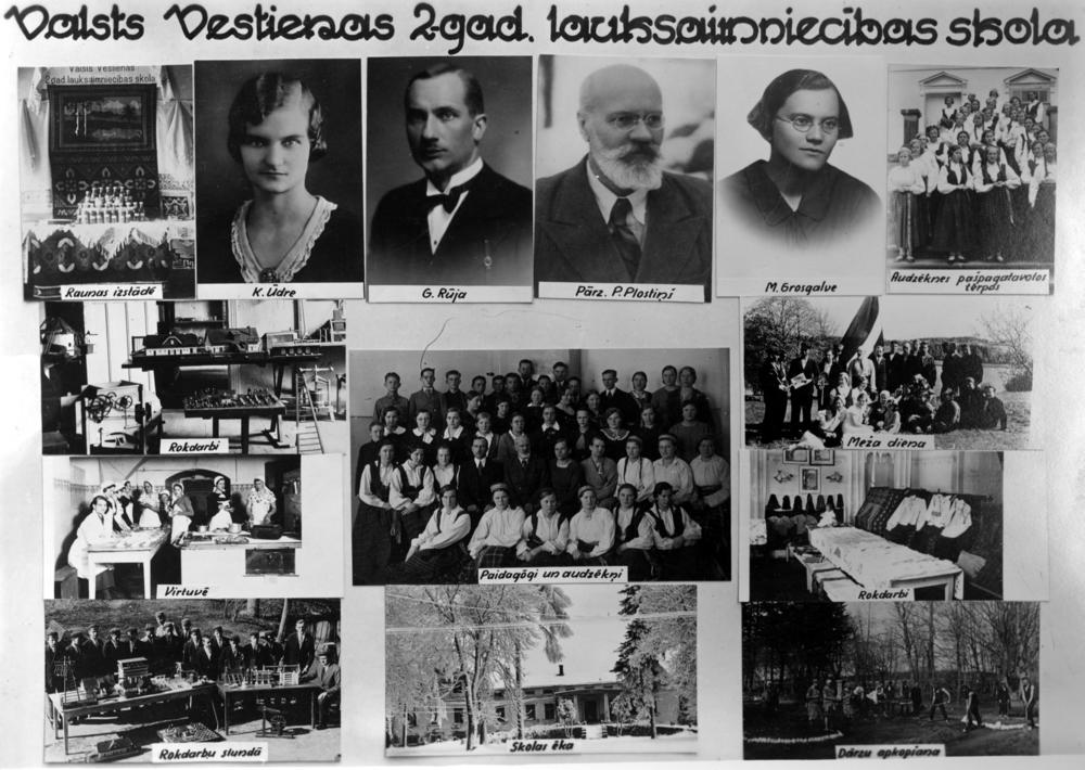 Valsts Vestienas divgadīgā lauksaimniecības skola. Augšējā 1. rindā no kreisās: 1. skolas stends izstādē Raunā, 2. K. Ūdre, 3. G. Rūja, 4. skolas pārzinis Pēteris Plostiņš, 5. M. Grosgalve, 6. skolas audzēknes pašu gatavotos tautas tērpos. 2. rindā no kreisās: 1. rokdarbu telpa (augšā), 2. virtuve (apakšā), 3. pedagogu un audzēkņu kopbilde, 4. audzēkņi meža dienās (augšā), 5. audzēkņu gatavotie rokdarbi (apakšā). 3. rindā no kreisās: 1. rokdarbu stunda, 2. skolas ēka, 3. dārzu apkošana. Fotomontāža.