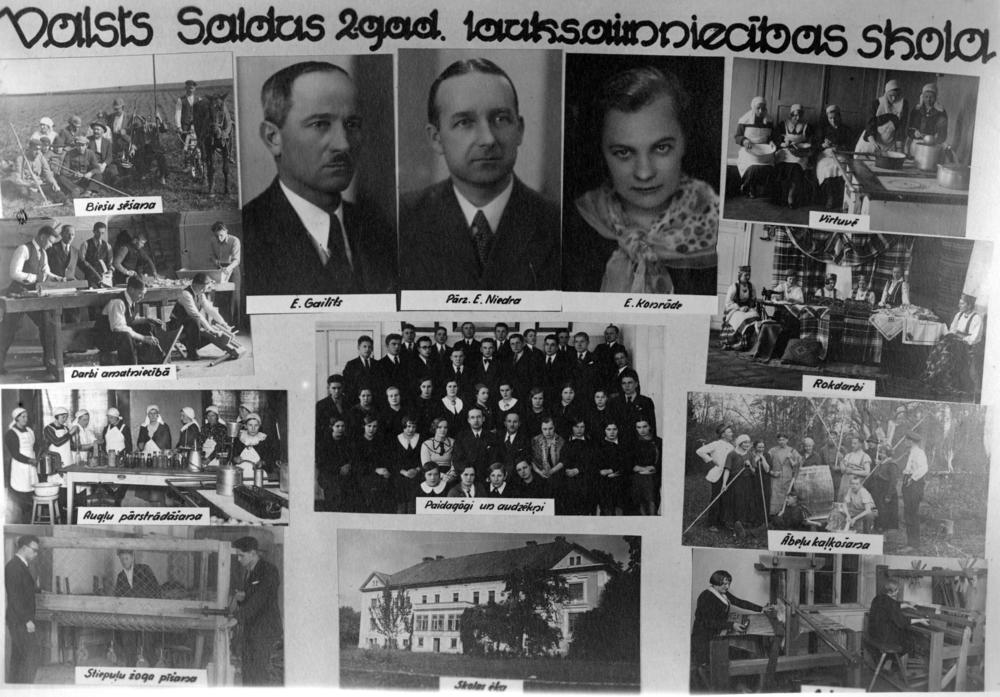 Valsts Saldus divgadīgā lauksaimniecības skola. Augšējā 1. rindā no kreisās: 1. biešu sēšana (augšā), 2. praktiskās nodarbības amatniecībā (apakšā), 3. E. Gailītis, 4. skolas pārzinis Edvīns Niedra, 5. E. Konrāde, 6. skolas audzēknes virtuvē (augšā), 7. audzēkņu darinātie rokdarbi (apakšā). 3. rindā no kreisās: 1. augļu pārstrādāšana, 2. pedagogu un audzēkņu kopbilde, 3. ābeļu kaļķošana. 4. rindā no kreisās: 1. stiepļu žoga pīšana, 2. skolas ēka, 3. aušanas nodarbība. Fotomontāža.