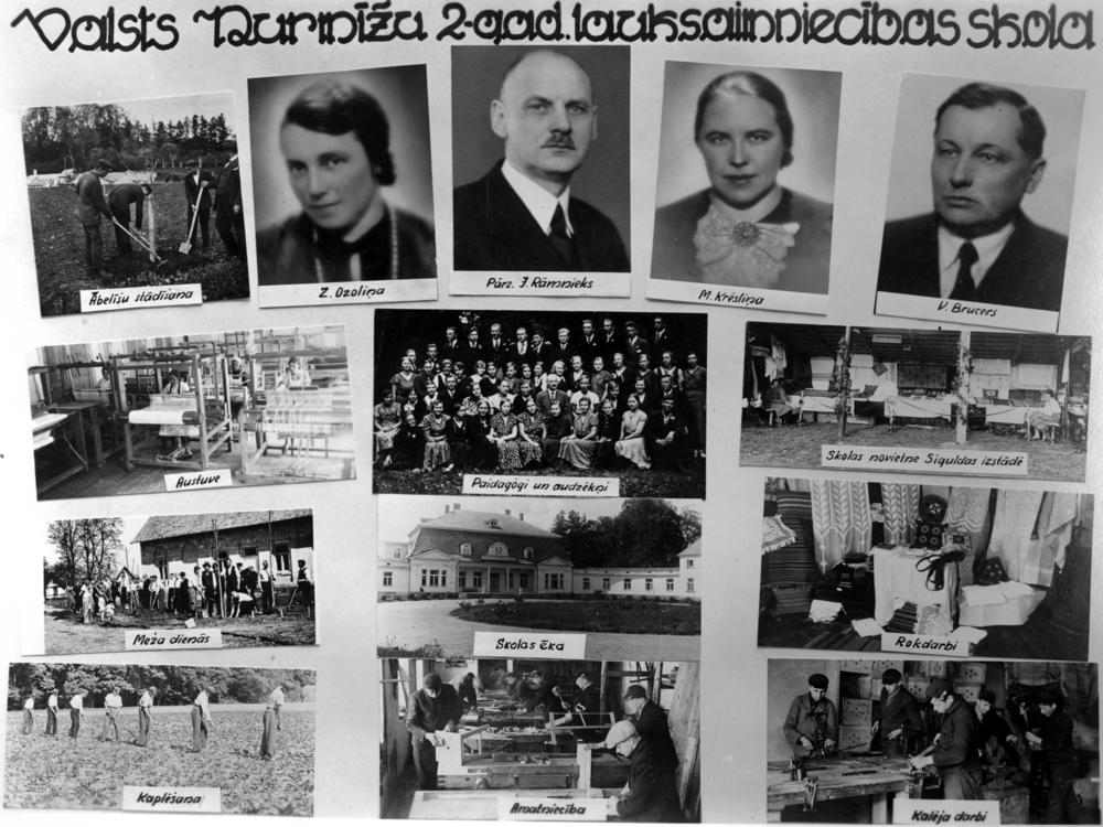 Valsts Nurmižu divgadīgā lauksaimniecības skola. Augšējā 1. rindā no kreisās: 1. ābelīšu stādīšana, 2. skolotāja Zenta Ozoliņa, 3. skolas pārzinis Jānis Rāmnieks, 4. M. Krēsliņa, 5. V. Brucers. 2. rindā no kreisās: 1. austuve, 2. pedagogu un audzēkņu kopbilde, 3. skolas stends izstādē Siguldā. 3. rindā no kreisās: 1. audzēkņi meža dienās, 2. skolas ēka, 3. audzēkņu darinātie rokdarbi. 4. rindā no kreisās: 1. kaplēšana, 2. praktiskās nodarbības amatniecībā, 3. kalēja darbi. Fotomontāža.